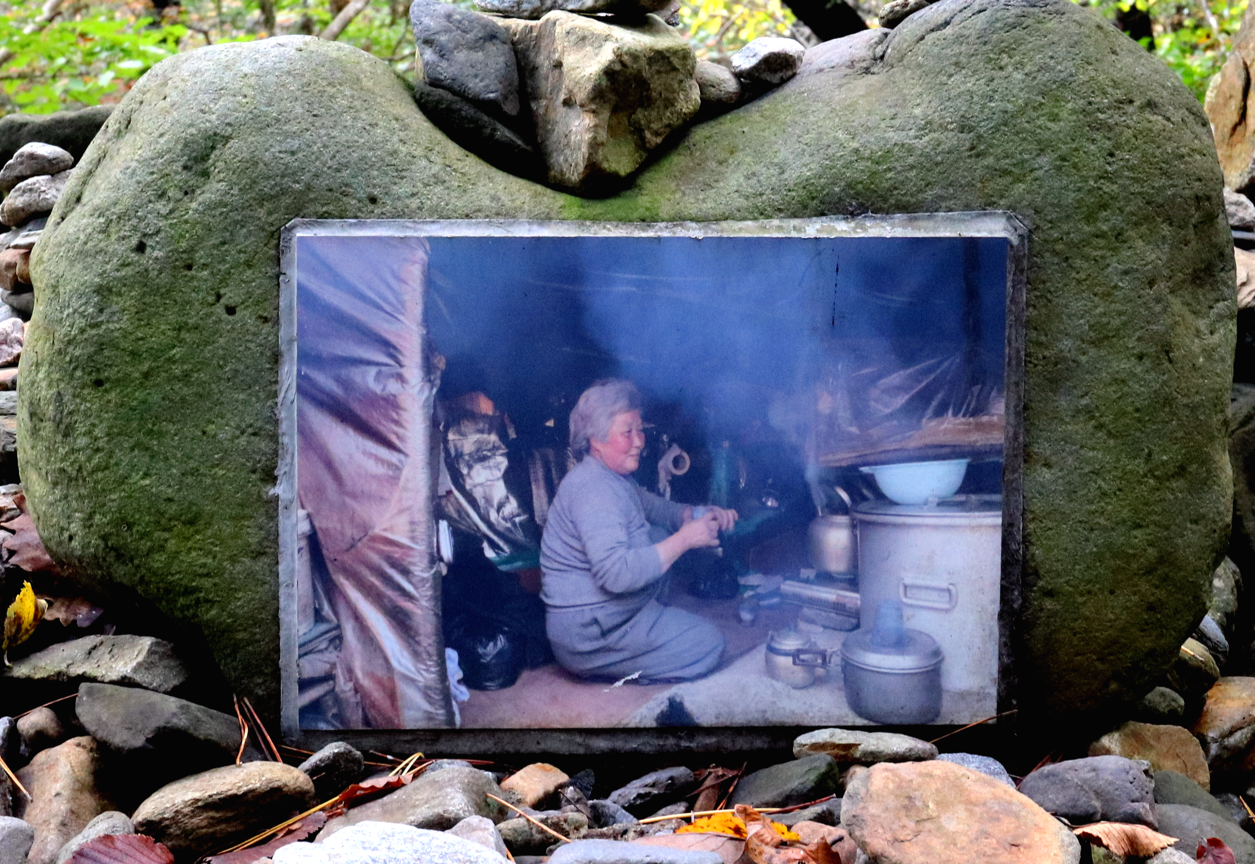 *움막집 돌담 위에는 움막에 거주할 당시 모습에 여사님이 사진이 놓여 있다*