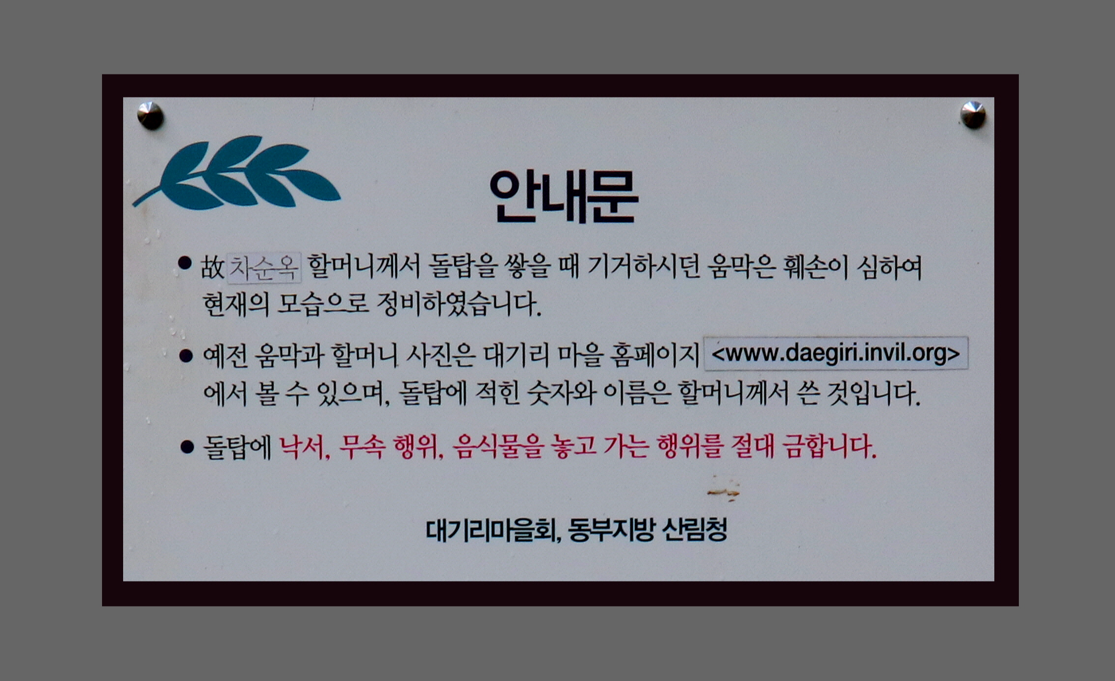 *돌에 쓰인 숫자와 이름은 차순옥 여사께서 기도하며 쓴것으로. 保存을 위해 낙서나 훼손하지 말라는 당부의 글판*