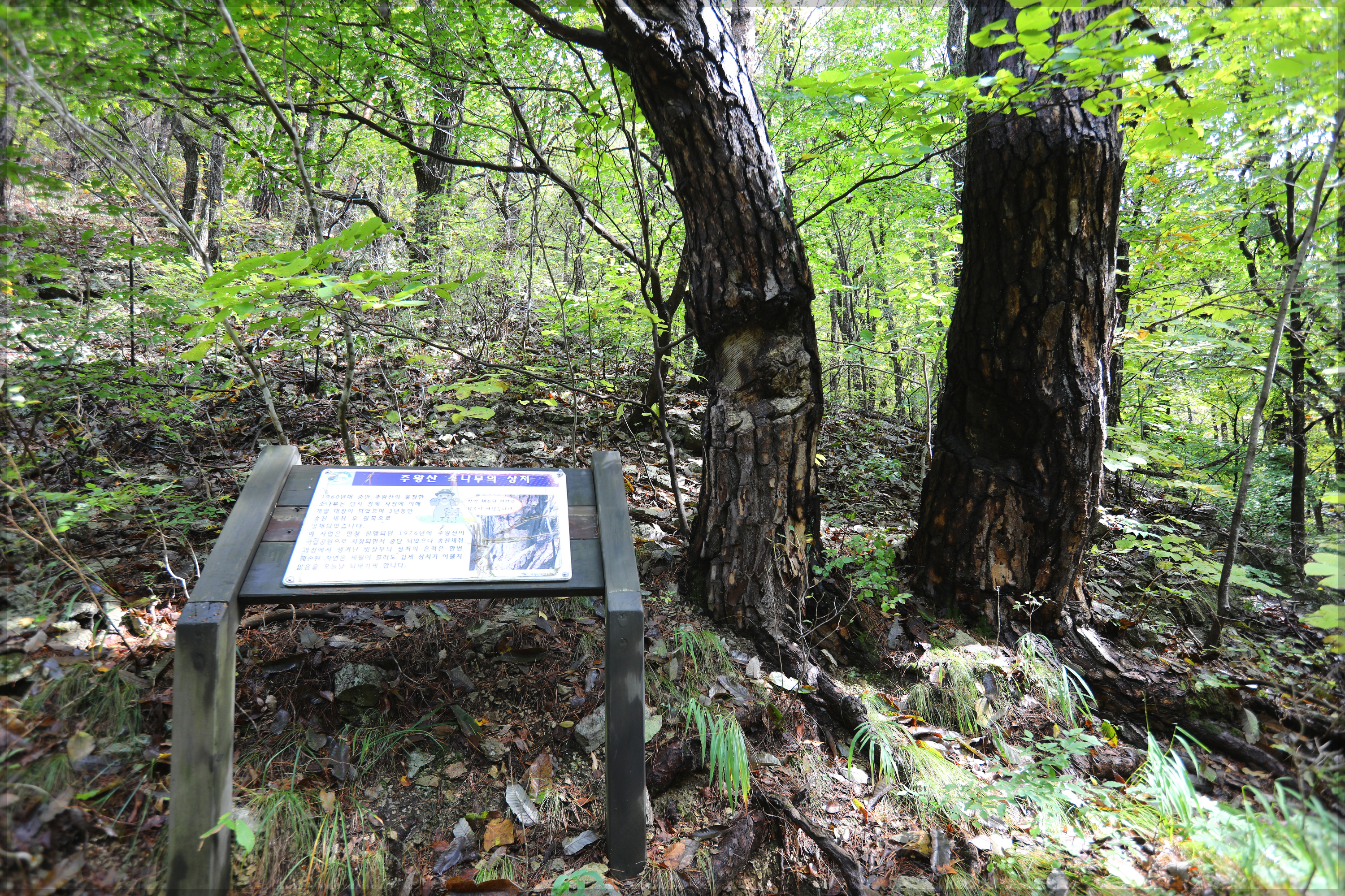 *1960대 중반 경제사업으로 송진 채취로 상처 입은 소나무들*