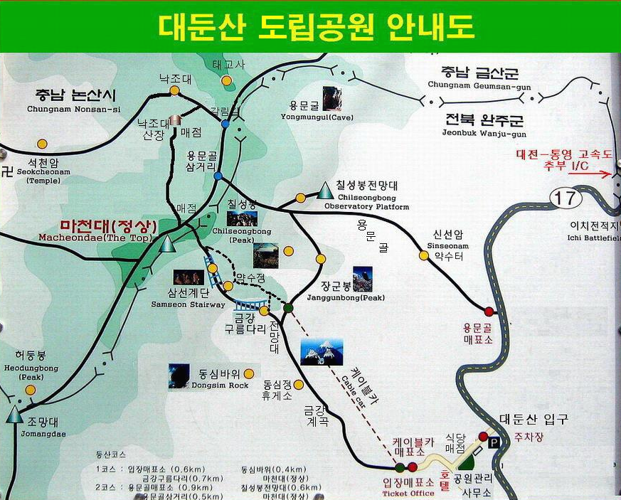 *대둔산은 높이 878m의 "호남의 금강산"이라고 불리며 천여 개의 암봉이 6km에 걸쳐 이어져 수려한 산세를